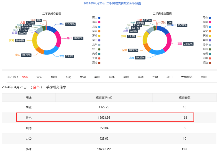 2024年4月23日二手房住宅网签168套。宝安20套;福田35套;龙岗33套;罗湖35套;南山19套;盐田2套;龙华14套;光明2套;坪山6套;大鹏2套。