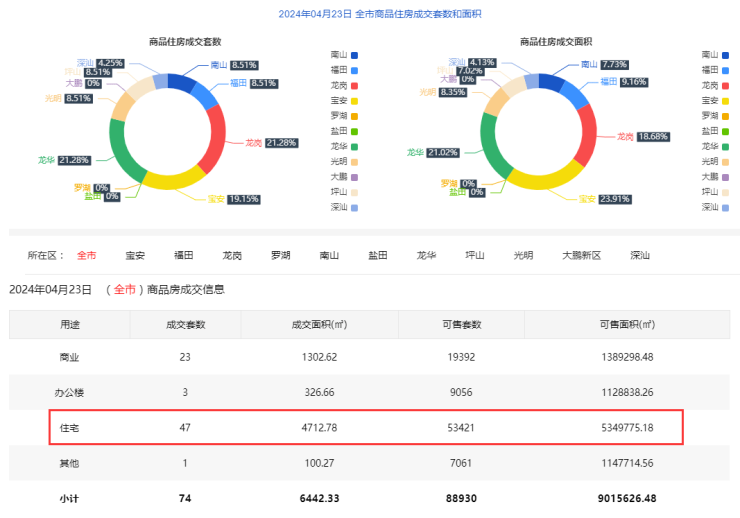 2024年4月23日新房住宅共网签47套。宝安9套;福田4套;龙岗10套;罗湖0套;南山4套;盐田0套;龙华10套;坪山4套;光明4套;大鹏0套;深汕2套。