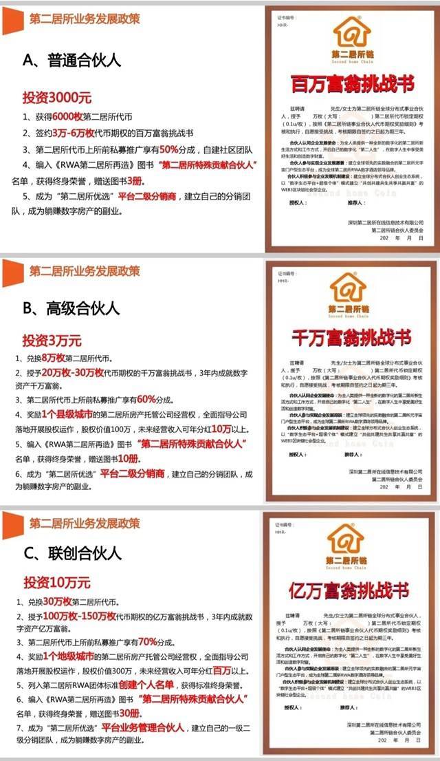 经问询后,对方给第一财经记者发来了一份普通人即可参与的“业务发展政策”,其中包括:投资3000元,成为普通合伙人,可获得6000枚代币,可自建社区团队,成为平台二级分销商,躺赚数字房产副业;投资3万元,成为高级合伙人,可兑换8万枚代币,奖励1个县级城市的房产托管公司经营权,未来经营收入可年分红10万以上;投资10万元,成为联创合伙人,兑换30万枚代币,3年内成就数字资产亿万富豪,奖励1个地级城市的房产托管公司经营权。
