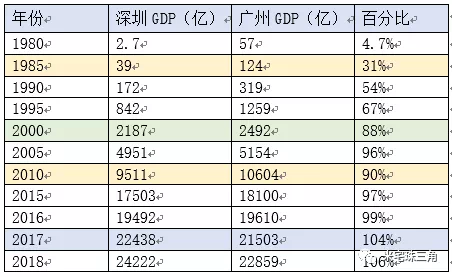 数据很直接,深圳从1980年起步时的区区2.7亿,体量不足广州的5%,一路狂奔,到2005年,GDP总量4951亿,已达到广州的96%。