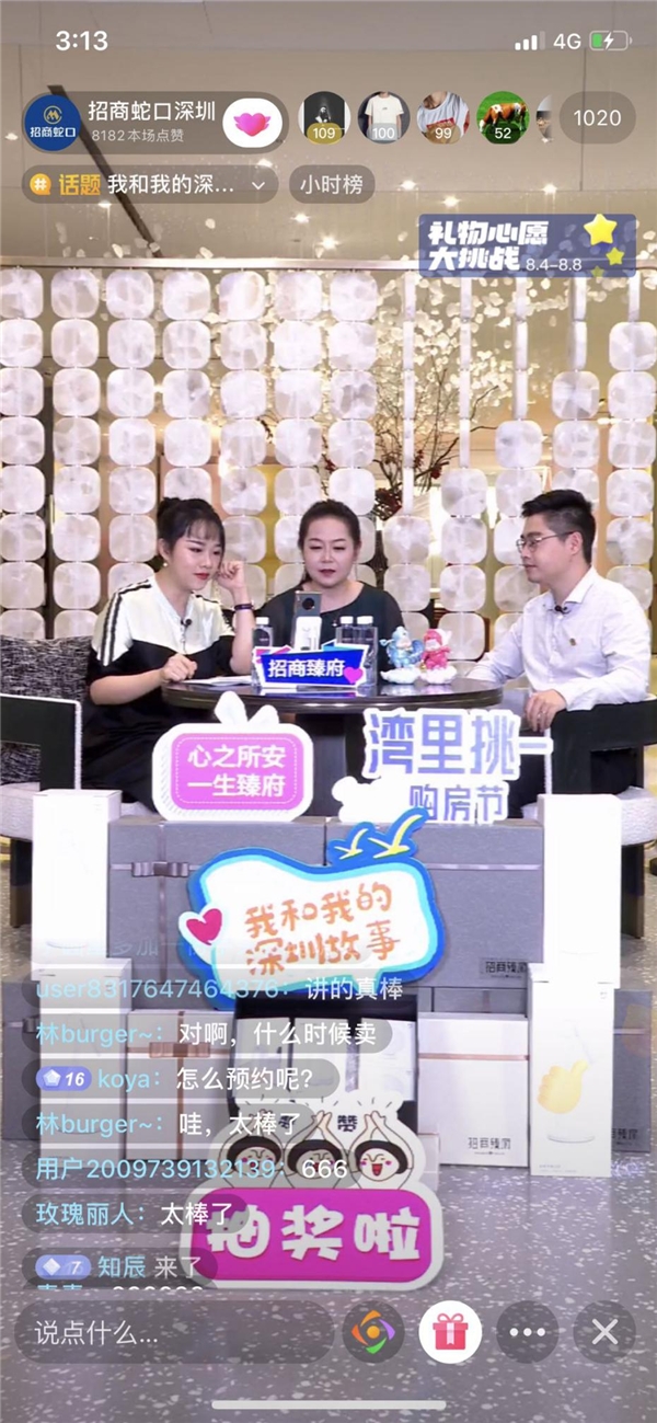 除了由肖全、刘宇等知名艺术家领衔拍摄的“我和我的深圳故事”抖音挑战赛,招商蛇口还同步在招商·领尚公馆、招商臻府、海谷科技大厦、会展湾·中港广场、玺悦台等多个项目的营销中心,举办专场直播活动,邀请深圳广电飞扬971主持人、本土人文学者、深圳新锐品牌创始人、深圳企业家、和年轻的营销精英们,分享他们的深圳故事,目前,已经举办两场活动,收到超十万人围观、超20万人点赞。