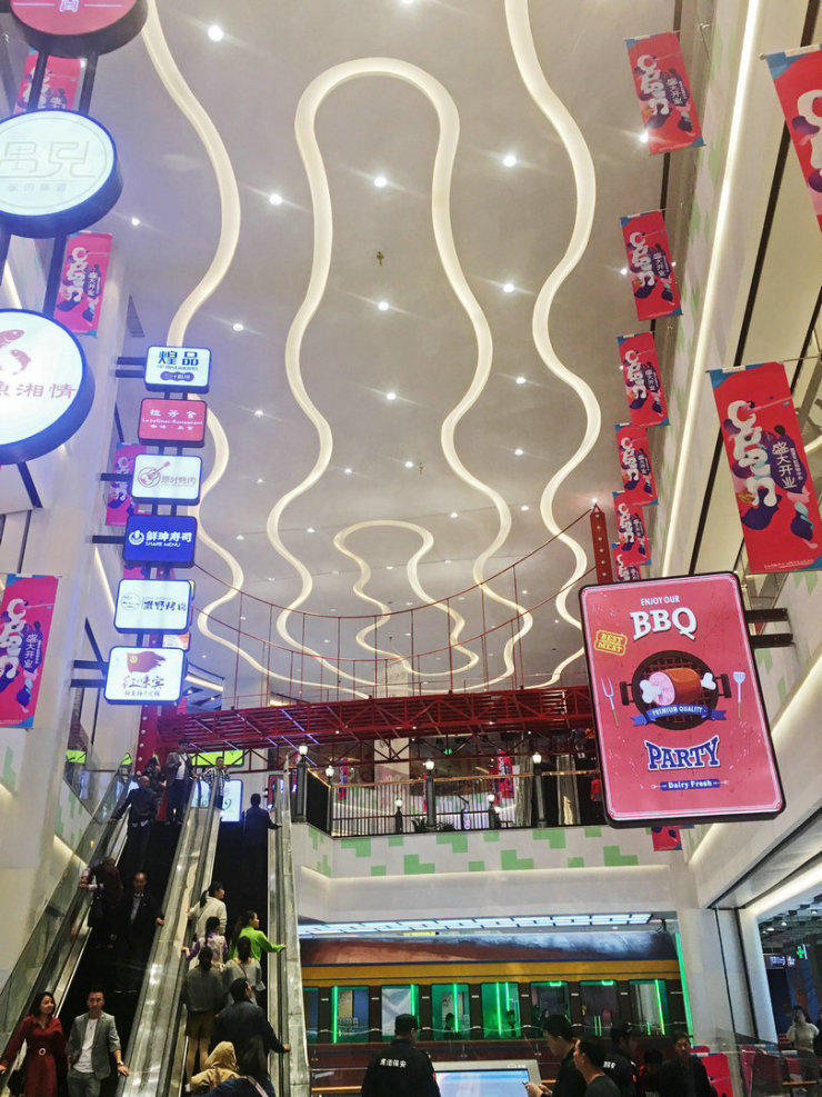 星空连廊,灵感来自梵高的名画《星空》,充分利用空间特点,在天花和墙壁用灯带营造出流转星空的迷人景象。此外,金门桥、音乐喷泉等特色装饰和互动装置随处可见,让不同年龄段的人,都可以随处找到属于自己的小欢乐,是到店打卡的必选之地。