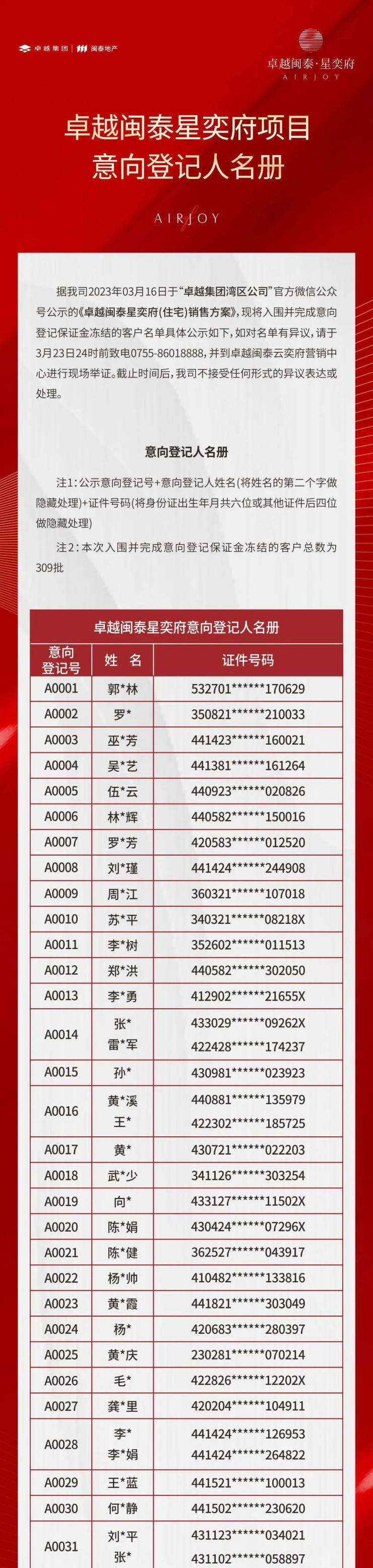 3月23日,卓越闽泰星奕府登记人名册公示,309批客入围。项目将于今日(3月24日)进行选房顺序号摇号,3月25日10:00正式选房。