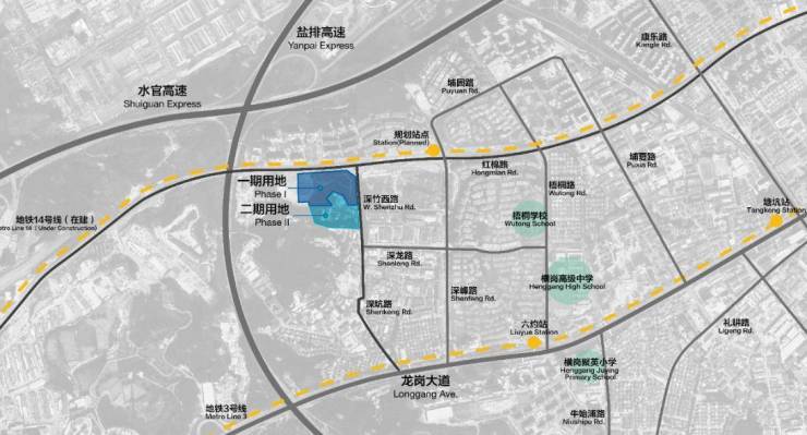 选址北侧为深圳地铁14号线,沿红棉路上设有规划站点,距离选址约 500米。深圳地铁3号线(龙岗线)沿龙岗大道上设有六约站(位于基地东南约1.2公里处)。