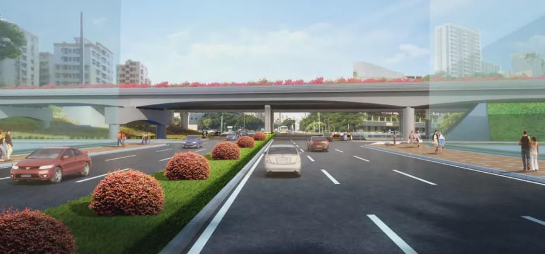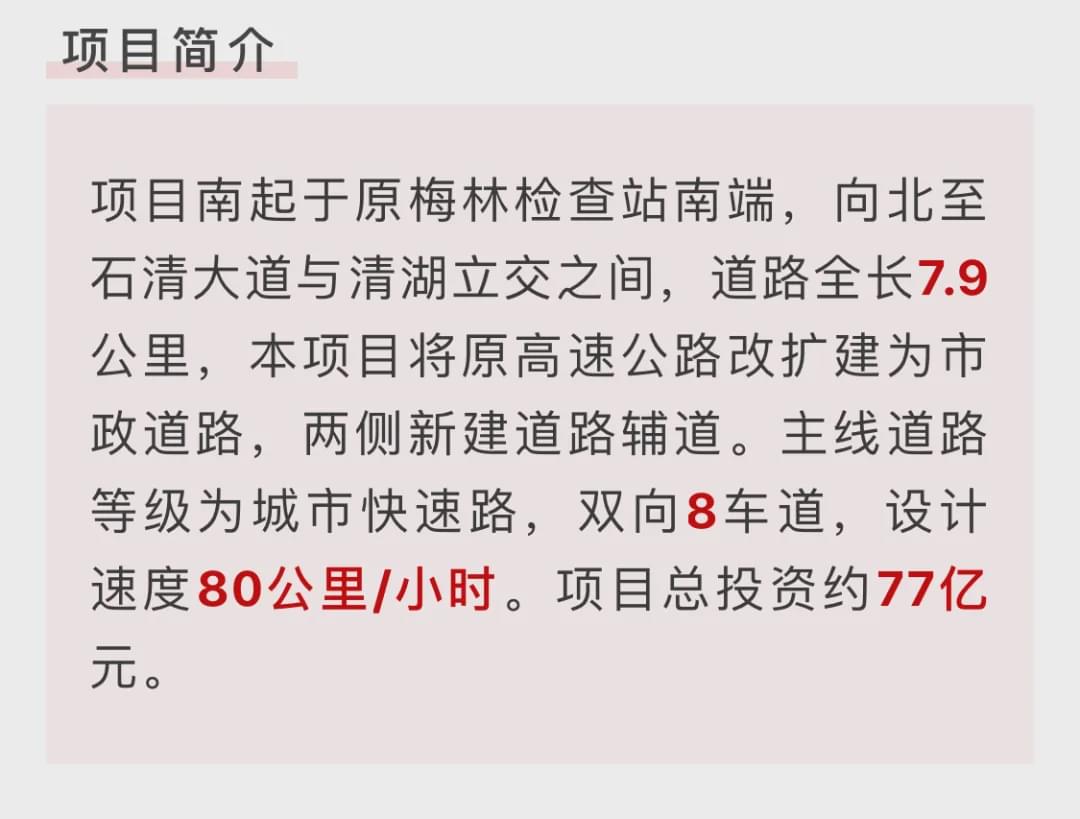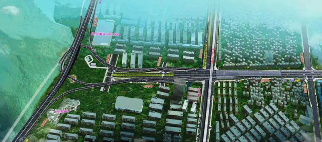 项目包含部分主线、地面辅道、6条匝道、主线长585米,采用城市快速标准,双向六车道,设计车速80公里/小时,全部为桥梁,总投资12.9亿元。