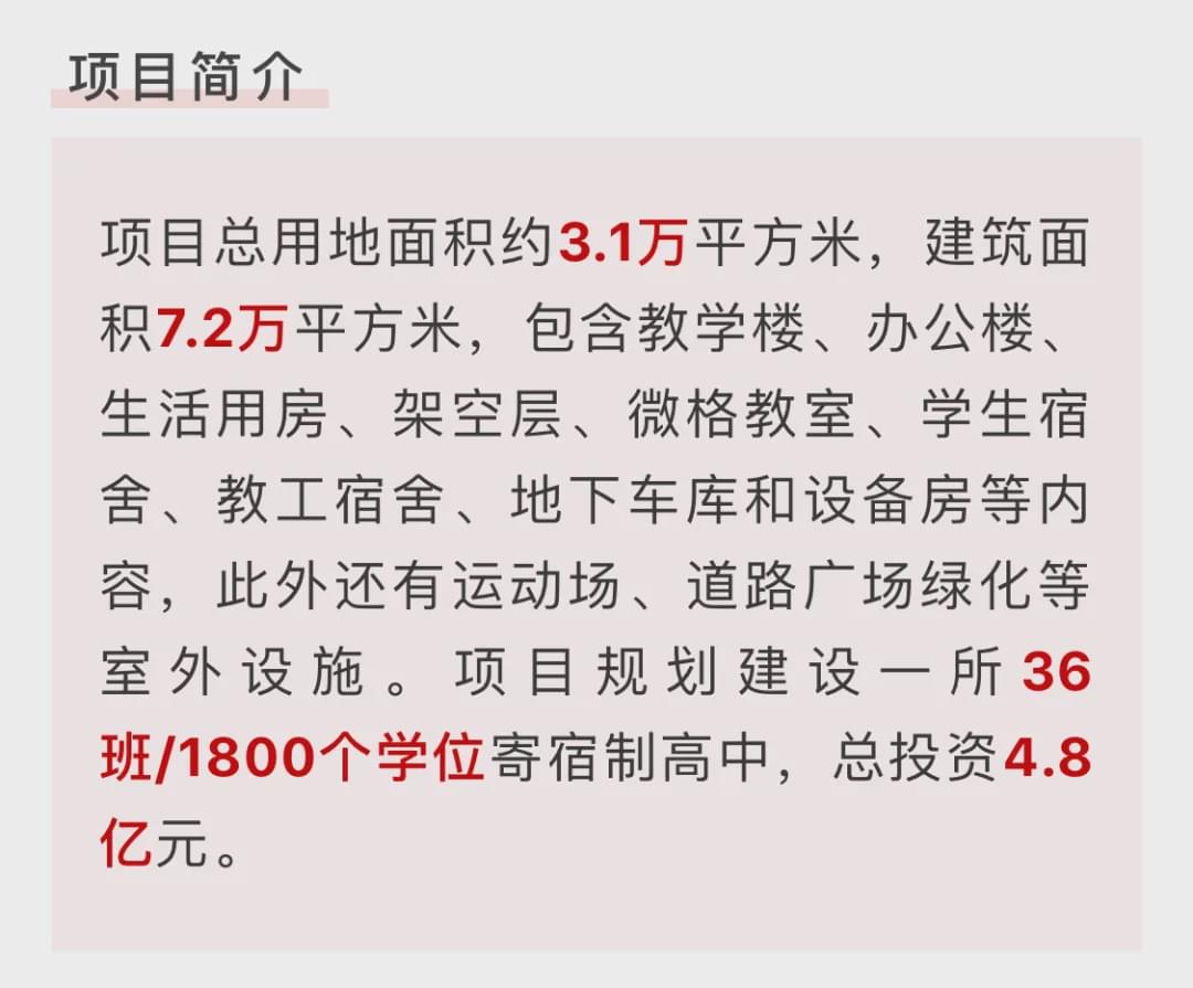 项目用地面积7.4万平米,建筑面积约14.8万平方米,拟建60班/3000个学位寄宿制高中,36班 /1800个学位初中,总投资8.8亿元。