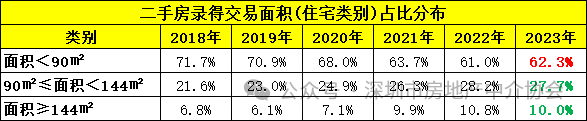 从成交面积的分布情况看,2023年在各项利好政策的推动下,90平米以下的成交占比相比22年有所增加,但从行业一线业务人员反馈,23年成交量户型主要为价格回调,较为“笋盘”的房源为主,而144平以上的大型豪宅,因价格相对坚挺,交易量占比较往年却有些许回落。