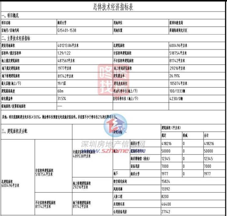 目前,深圳海洋大学项目一期已开工,项目建设内容包括教学及办公用房12.52万平方米、公共用房5.26万平方米、科研用房14.62万平方米、生活及配套用房14.62万平方米、其他(架空层及连廊)2.91万平方米、地下建筑(车库及人防、设备用房)8.38万平方米。
