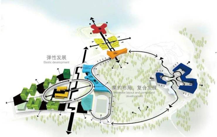 利用场地南北两侧山体、内部山塘等特色风貌,形成一个从北往南自发生长的主景观轴,通过场地竖向的分析,整理出其两侧场地相对平整的学术轴,结合东侧林地景观的渗入以及主导风向,形成逻辑清晰纵横交错的规划结构空间。