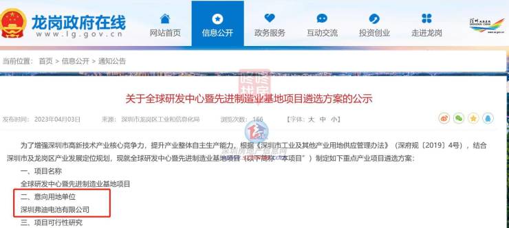 2023年4月,深圳市龙岗区工业和信息化局发布《关于全球研发中心暨先进制造业基地项目遴选方案的公示》,意向用地单位为比亚迪系。