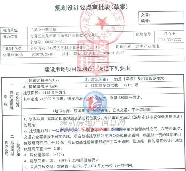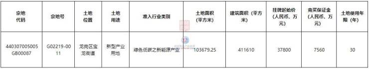 宗地号G02219-0011,土地位置龙岗区宝龙街道,土地用途新型产业用地,准入行业类别绿色低碳之新能源产业,土地面积103679.25平方米,建筑面积411610平方米,挂牌起始价37800万元,土地使用年限30年。