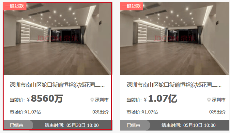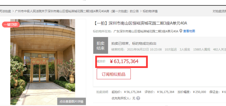 两年前,2021年6月,南山恒裕滨城2期一套法拍房曾拍出6318万,单价27.6万/㎡。该法拍房源在京东法拍进行拍卖,建面228.72平,起拍价56175364元,3人参与竞拍,吸引17394人围观,经历了18次出价,最终以63175364元成交。