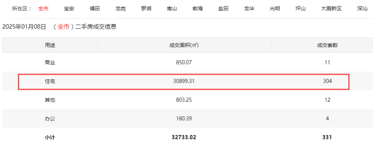 2025年1月8日二手房住宅网签304套。其中,宝安41套;福田55套;龙岗68套;罗湖38套;南山49套;盐田6套;龙华35套;坪山5套;光明5套;大鹏2套。