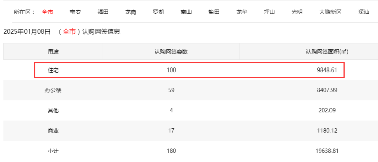 2025年1月8日新房住宅认购网签100套。其中,宝安17套;福田3套;龙岗23套;罗湖2套;南山5套;盐田0套;龙华24套;坪山0套;光明25套;大鹏1套;深汕0套。