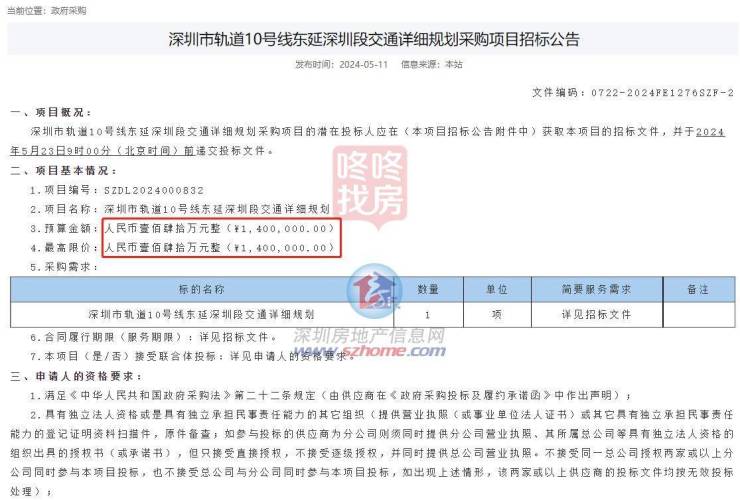 5月11日,深圳市轨道10号线东延深圳段交通详细规划采购项目对外招标。