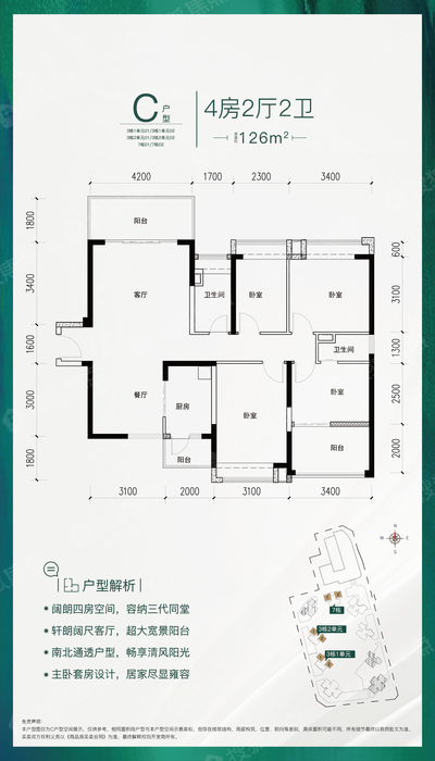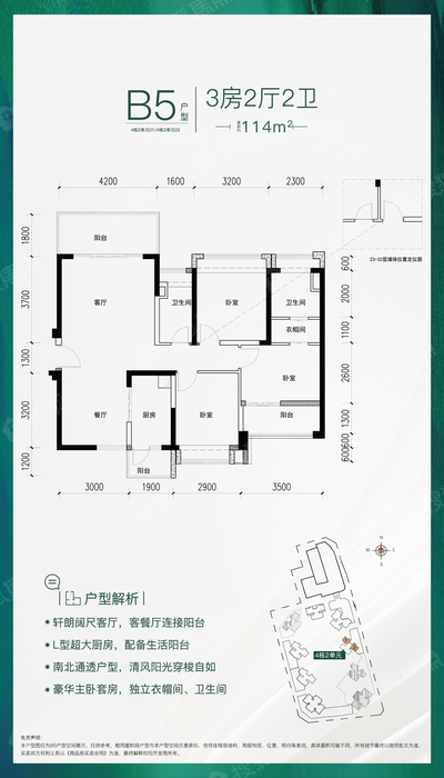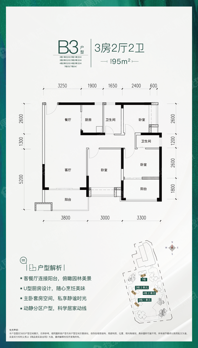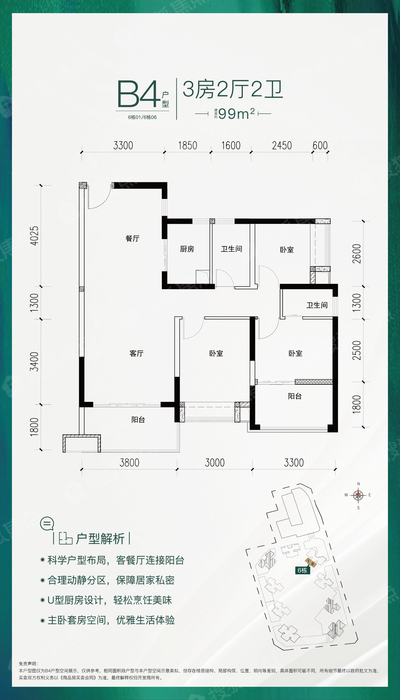 客厅朝向东北,通透布局大开间短进深,通风采光性能良好。客厅开间4.2米带有1.8米进深大阳台,宽敞舒适。主卧自然通透宽敞明亮功能全面,双次卧配置均衡。餐厨空间紧凑独立,自然同分采光性能良好,厨房带有独立生活阳台。