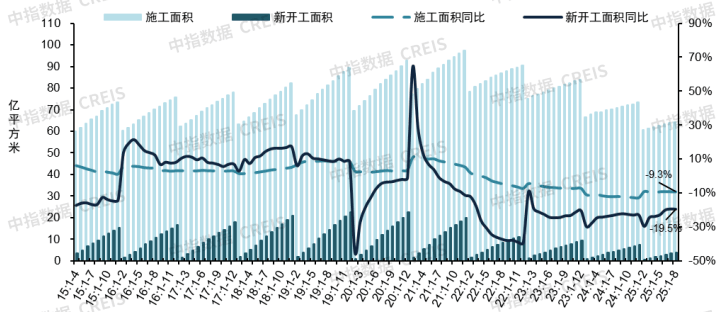 房屋施工面积:1-8月,全国房屋施工面积为64.31亿平方米,同比下降9.3%;其中,住宅施工面积为44.85亿平方米,同比下降9.6%。