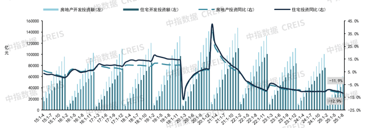 房地产开发投资额:1-8月,全国房地产开发投资额为6.03万亿元,同比下降12.9%;其中,住宅开发投资额4.64万亿元,同比下降11.9%。