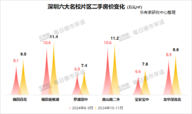 房价方面,10-11月的价格和8-9月比也有明显的“止跌”。乐有家研究中心统计显示,近期宝安的宝安中学片区,二手房成交价回调至7.6万元/㎡,福田的百花片区价格回调至9.0万元/㎡,与8-9月比涨幅都在10%以上,是一个好兆头。兼具名校教育属性和优越地理位置的地段,整体抗跌性、回暖势头也明显较强。