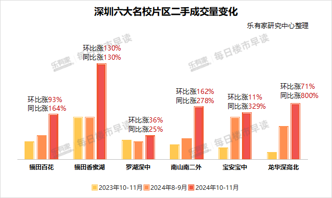 深圳乐有家门店签约数据显示,2024年10月至今,各大名校片区的二手成交量均有大幅度的上涨。其中南山南二外片区环比涨幅最高,达到162%,同比涨幅278%;龙华深高北片区同比涨幅最高,达到800%,环比上涨71%。