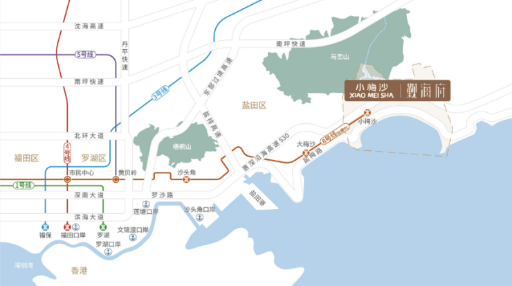 海陆空轨 交通便捷:深圳地铁8号线二期(2号线延长线)直达小梅沙站,“4+1”路网(盐坝高速、盐排高速、沈海高速、惠深沿海高速以及盐梅路)快慢相携。海陆空轨全维交通体系,满足都市畅快出行体验,让湾区轻松实现对话世界。
