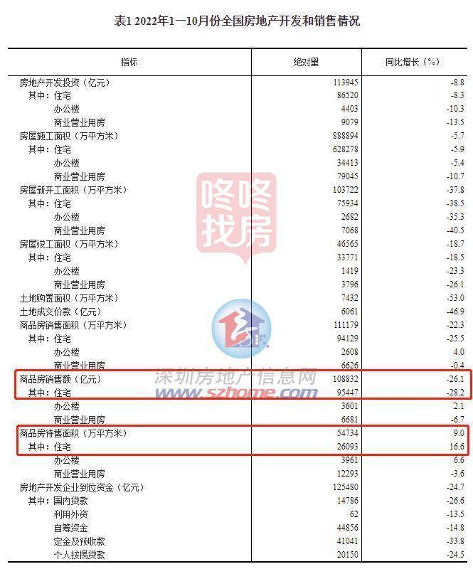 1—10月份,商品房销售面积111179万平方米,同比下降22.3%,其中住宅销售面积下降25.5%。商品房销售额108832亿元,下降26.1%,其中住宅销售额下降28.2%。