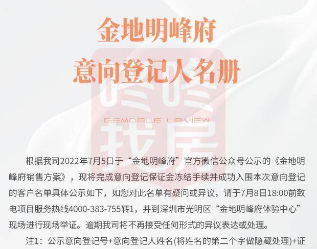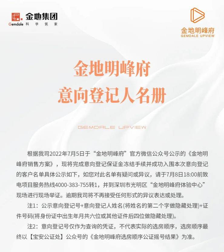 金地明峰府登记人名册公示,共288批客成功意向登记;项目将于7月9日进行选房顺序号摇号。