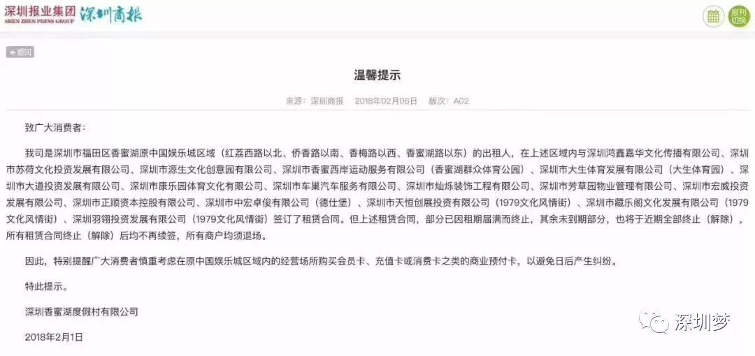 2月6日A02版《温馨提示》,深圳香蜜湖度假村有限公司发通告宣布“所有商户均须退场”。