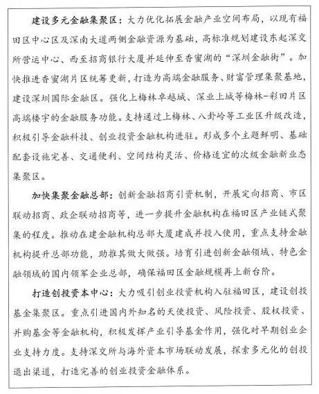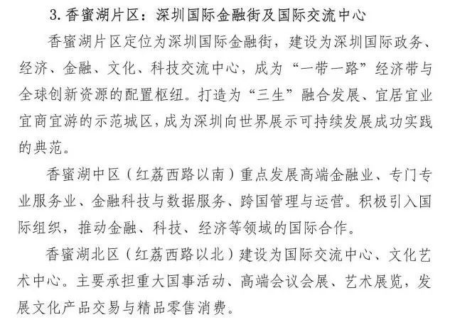 《规划》中明确提出“建设多元金融集聚区:大力优化拓展金融产业空间布局,以现有福田区中心区及深南大道两侧金融资源为基础,高标准规划建设东起深交所营运中心、西至招商银行大厦并延伸至香蜜湖的‘深圳金融街’。加快推进香蜜湖片区统筹更新,打造为高端金融服务、财富管理集聚基地,建设深圳国际金融区。”
