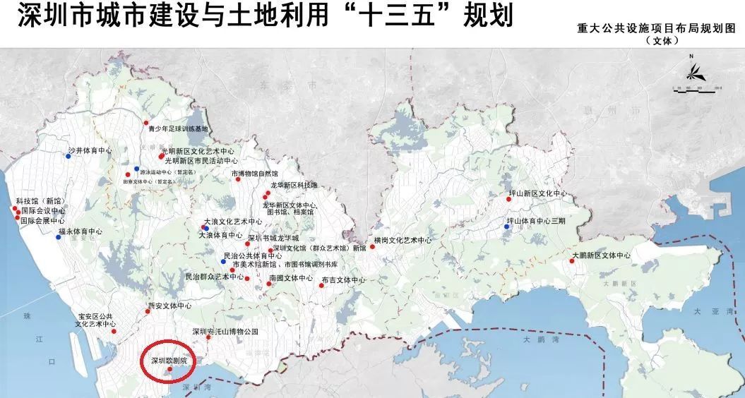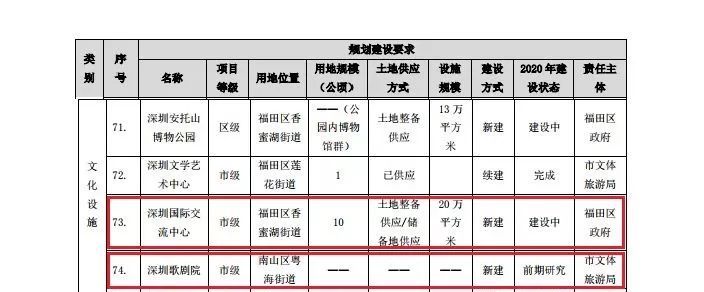 不过,之后,在2017年11月13日发布的《深圳市规划国土委 深圳市发展改革委 关于印发深圳市城市建设与土地利用“十三五”规划的通知》的《“十三五”重大公共设施项目一览表》中,深圳歌剧院的选址已经改为南山深圳湾,用地位置属于南山粤海街道,而设施规模为20万平方米的深圳国际交流中心保留在香蜜湖片区。