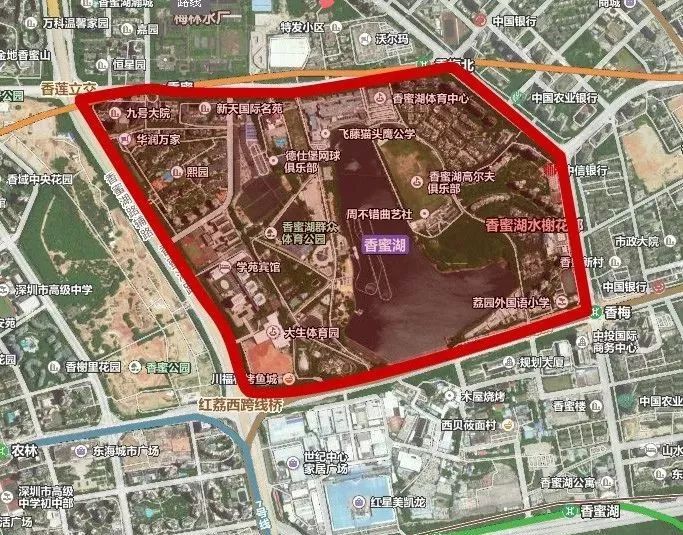 这则温馨提示中的“香蜜湖原中国娱乐城区域”的范围有多大呢?红荔西路以北、侨香路以南,香蜜湖路以东,香梅路以西,就是下图红线圈出来的部分: