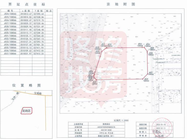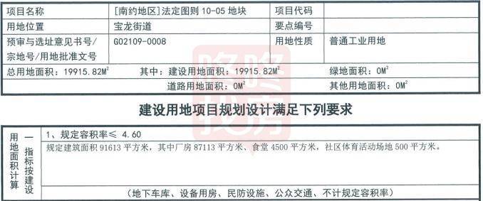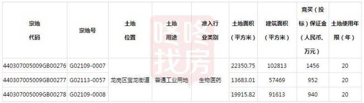宗地号G02109-0008宗地,土地位置龙岗区宝龙街道,土地用途普通工业用地,准入行业类别生物医药,土地面积为19915.82平方米,建筑面积为91613平方米,竞买保证金940万元,土地使用年限为20年。