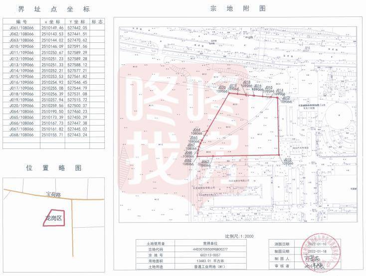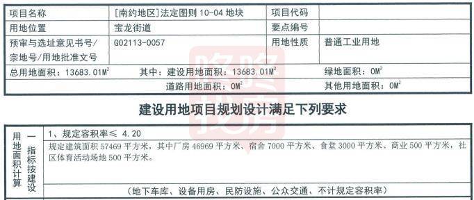 宗地号G02113-0057宗地,土地位置龙岗区宝龙街道,土地用途普通工业用地,准入行业类别生物医药,土地面积为13683.01平方米,建筑面积为57469平方米,竞买保证金952万元,土地使用年限为20年。