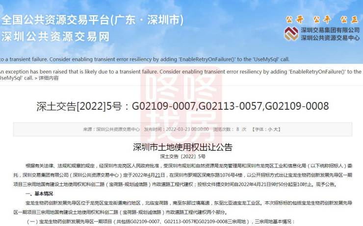 公告显示,本次深圳交易集团有限公司(深圳公共资源交易中心)以公开招标方式公开出让宝龙生物药创新发展先导区一期项目和科创二路(宝荷路-规划诚信路)市政道路工程代建权。