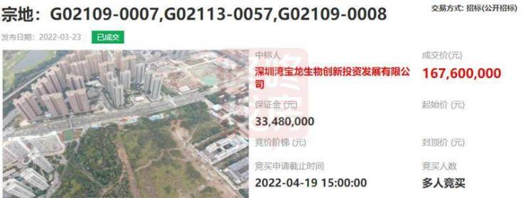 今日(4月21日),位于龙岗宝龙街道的3宗普通工业用地招标结果出炉,中标人为深圳湾宝龙生物创新投资发展有限公司,中标价16760万。