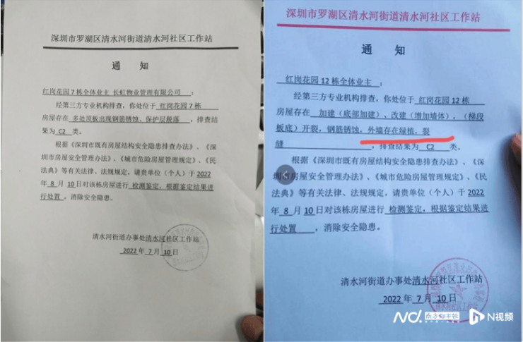 记者获悉关于红岗花园房屋鉴定结果的几份通知显示,该小区2栋、4栋、5栋、7栋、12栋、15栋排查结果为C2类,3栋、14栋排查结果为C1类,落款单位为清水河街道办事处清水河社区工作站,落款时间为2022年7月10日。