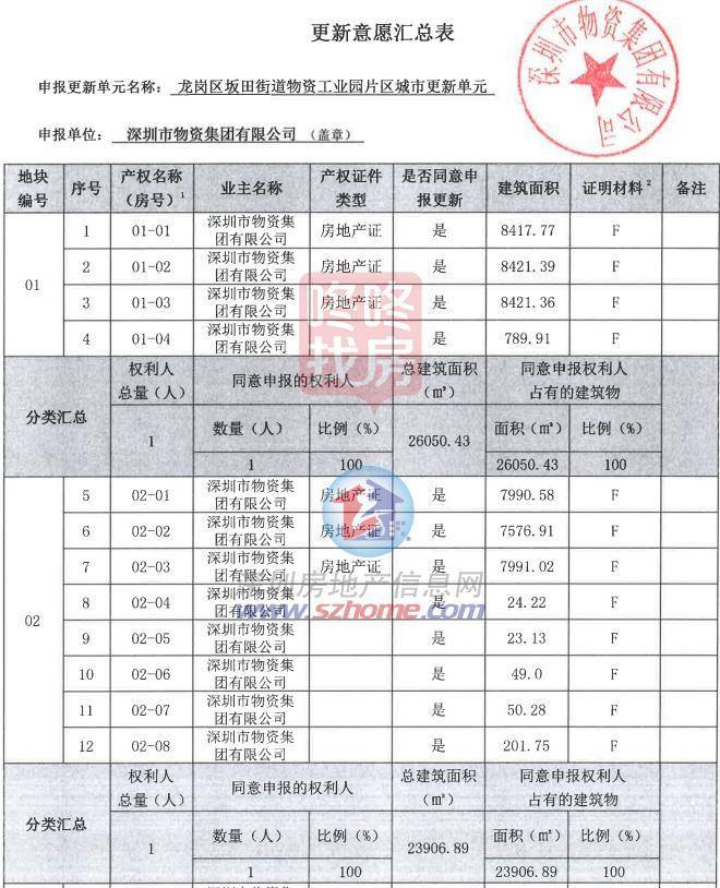 根据公示的更新意愿汇总表显示,项目总共有6个地块,权利人全部为深圳市物资集团有限公司,同意申报比例为100%。