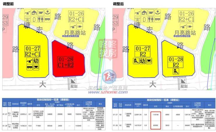 公示显示,为加快招拍挂出让工作,拟对光明区轨道13号线车辆段片区重点城市更新单元01-27、01-28地块进行规划调整,两宗地此前规划为二类居住用地+商业用地(R2+C1),此次调整为“纯住宅用地”,容积率也均有下调。