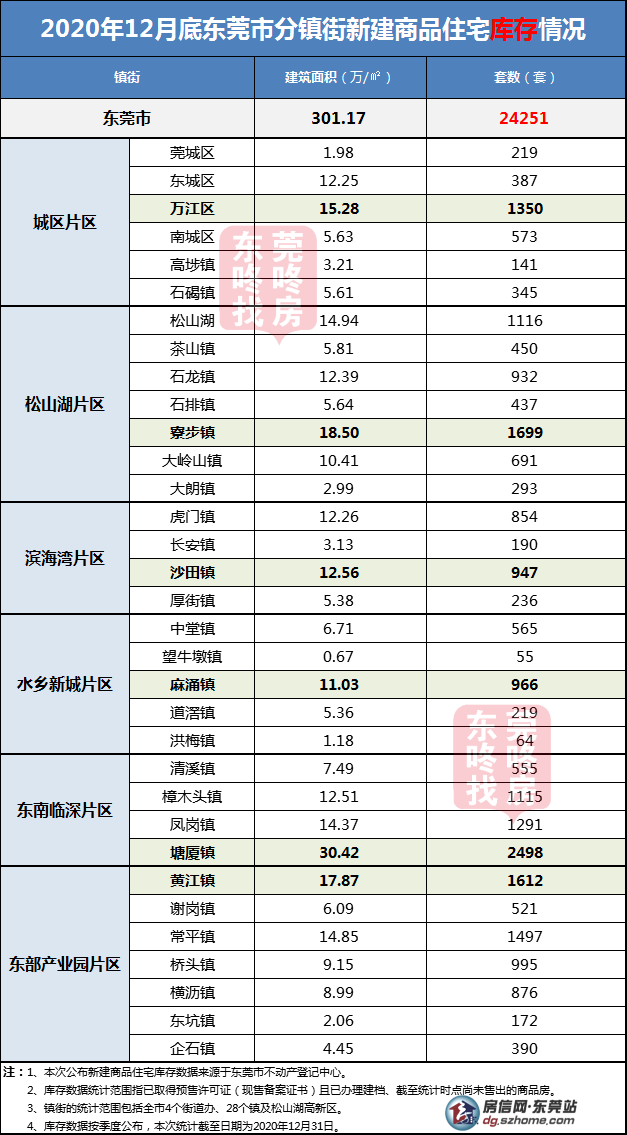 截至12月底,全市新建商品住宅库存24251套,建面约301.17万㎡;其中塘厦镇以库存量2498套、建面30.42万㎡继续夺得库存“双榜首”,寮步镇居于其次。