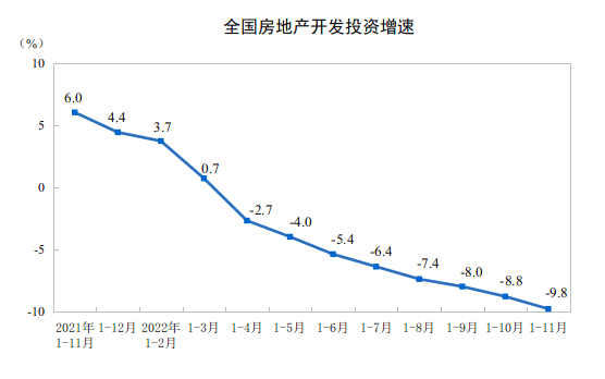2022年1—11月份全国房地产开发投资数据也已经出炉,下降9.8%。