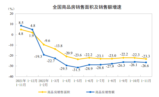 1—11月份,商品房销售面积121250万平方米,同比下降23.3%,其中住宅销售面积下降26.2%。商品房销售额118648亿元,下降26.6%,其中住宅销售额下降28.4%。