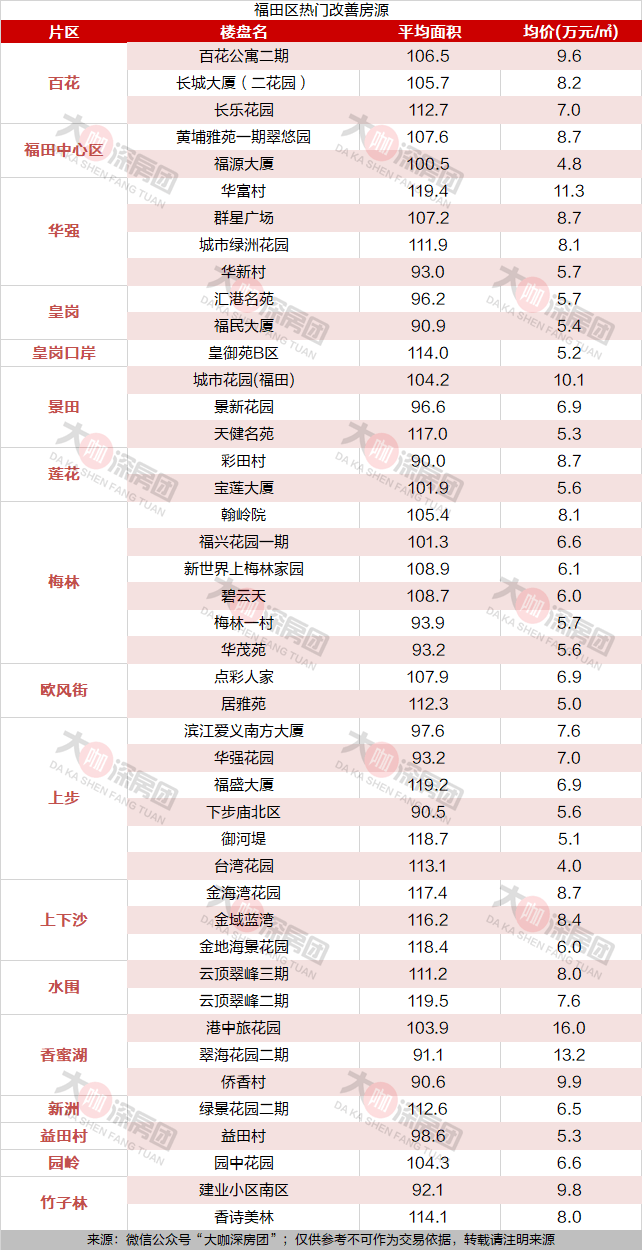 在筛选出来的44个福田改善房中,其中主要分布在梅林片区与上步片区,两片区各有6个楼盘。