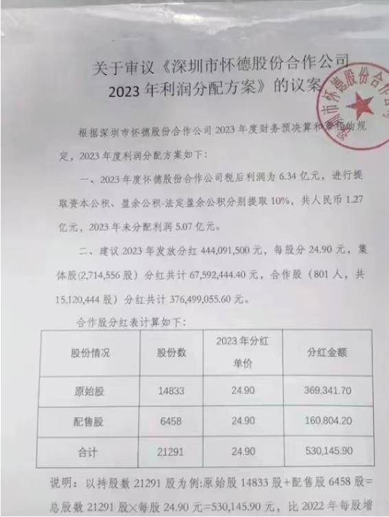 流出图片显示,深圳市怀德股份合作公司(以下简称怀德村)2023年利润分配方案如下: