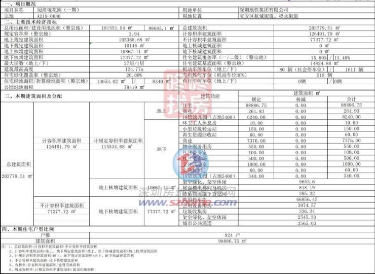 根据建筑许可证信息显示,一期总建筑面积203779.51平方米,其中计容积率建面126401.79平方米,住宅建面98886.75平方米,还有幼儿园、商业、社区菜市场等。停车位1691个。