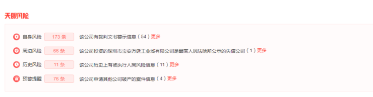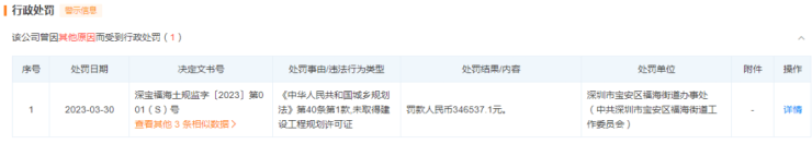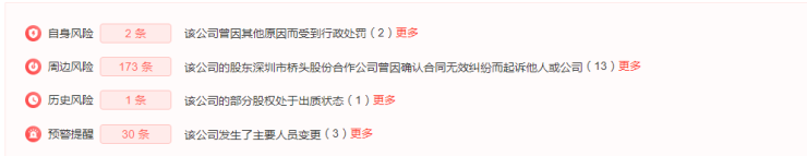 其母公司深圳市桥头股份公司也有多条风险提示,自身风险有173条,其中包括一条行政处罚,因“未取得建设工程规划许可证进行建设”被罚款34.65万元。
