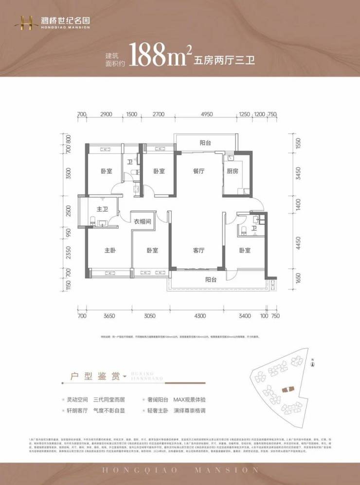 建面约188㎡的5房户型分布在F座。