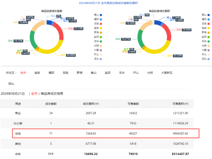 2024年8月21日新房住宅共网签71套。宝安22套;福田1套;龙岗15套;罗湖2套;南山4套;盐田0套;龙华14套;坪山2套;光明11套;大鹏0套;深汕0套。