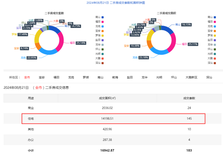 2024年8月21日二手房住宅网签145套。宝安15套;福田23套;龙岗40套;罗湖25套;南山26套;盐田4套;龙华8套;光明1套;坪山3套;大鹏0套。