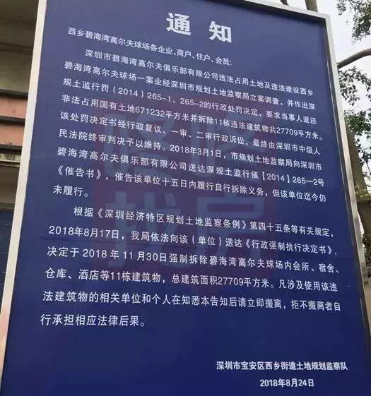 8月24日,西乡街道土地规划监察队向西乡碧海湾高尔夫球场各企业、商户、住户、会员发布通知,要求当事人退还非法占有国有土地671232平并拆除11栋违法建筑物共27709平,并将于11月30日,强制拆除碧海湾高尔夫球场内会所、宿舍、仓库、酒店等11栋建筑物,总建筑面积27709平。