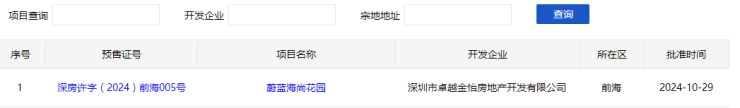 10月29日,卓越蔚蓝海尚花园(卓越前海未来城一期)获批预售许可证,共备案600套房源,其中两套是样板间,本批推售房源598套。